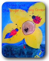 One of the things that we pride ourselves on at Starbright, is our drive to teach through hands on learning. Young minds are so creative and when channeled through a hands-on teaching method, the lessons learned are seldom forgotten. Kids learn though play. Educational "toys" and workshops are set up to teach through play.